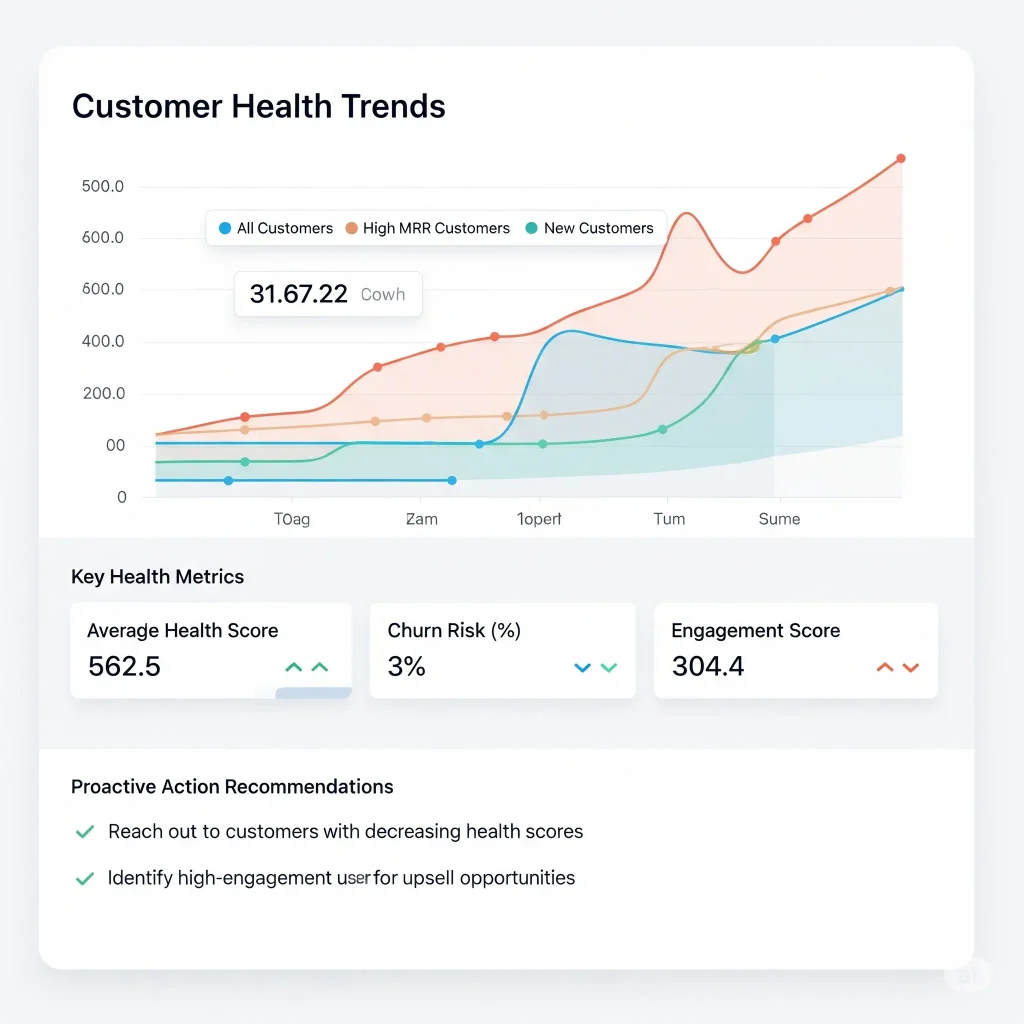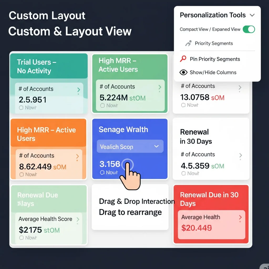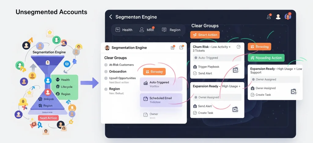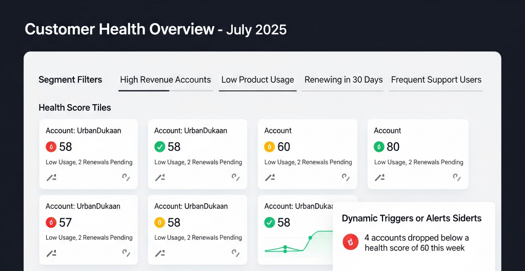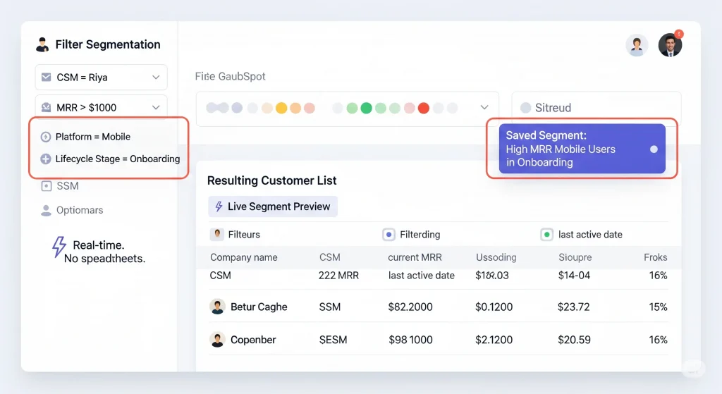Segment accounts using precise filters like churn status, usage trends, MRR, or assigned CSM, purpose-built to support every stage of the customer journey.