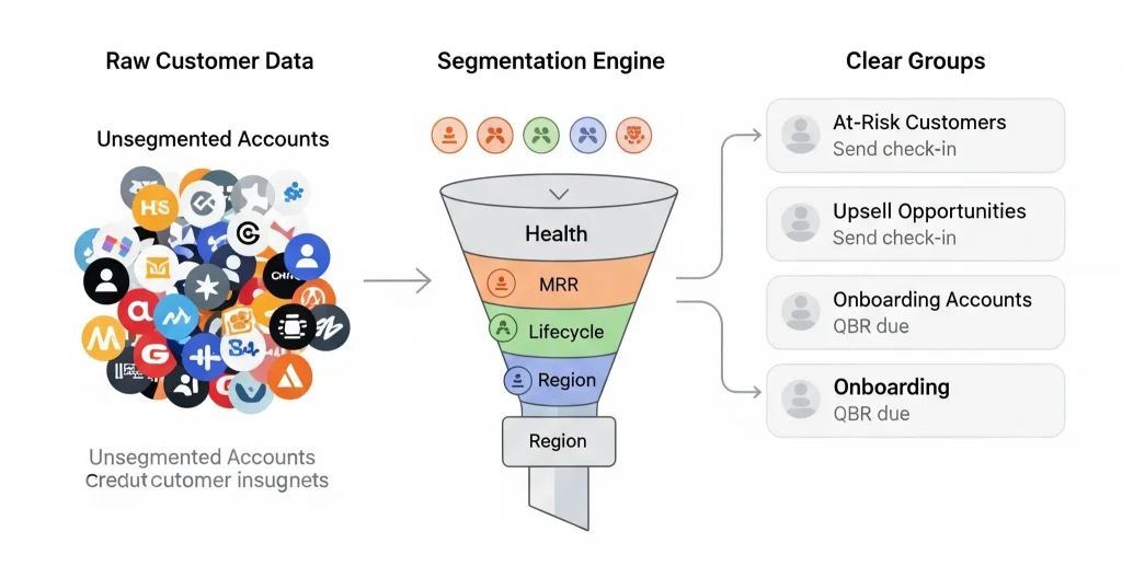 Get granular with your customer data using CSNook. Segment accounts with precision, drive proactive actions, and boost retention with real-time, attribute-based insights.