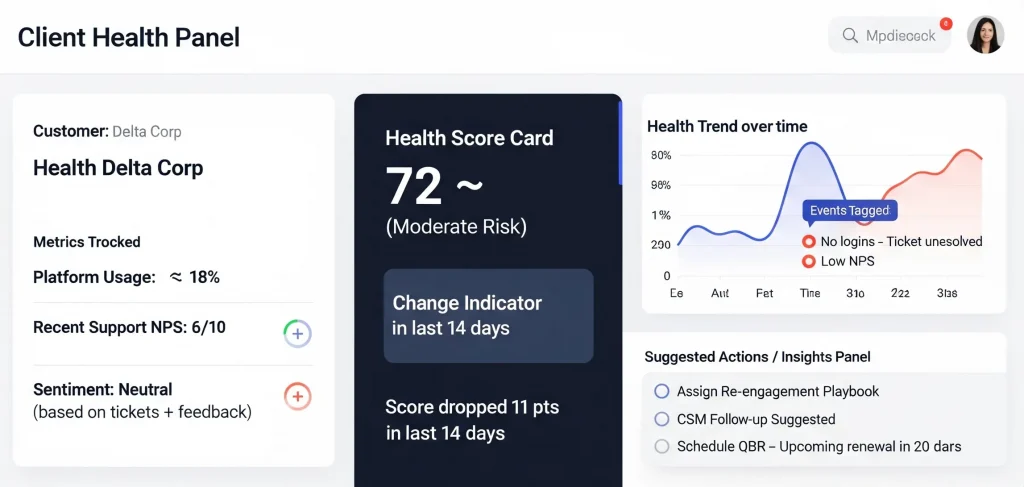 Monitor key metrics like usage, satisfaction, and sentiment to prevent churn and drive upsells.