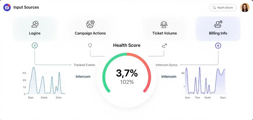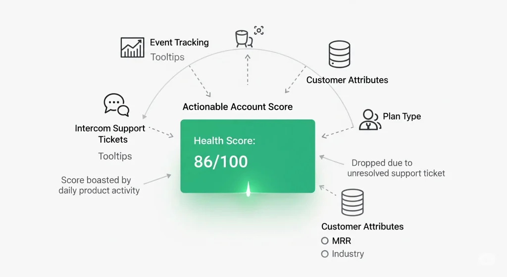 Logins, campaign actions, ticket volume, billing info—all flow into the health score via tracked events and Intercom syncs.