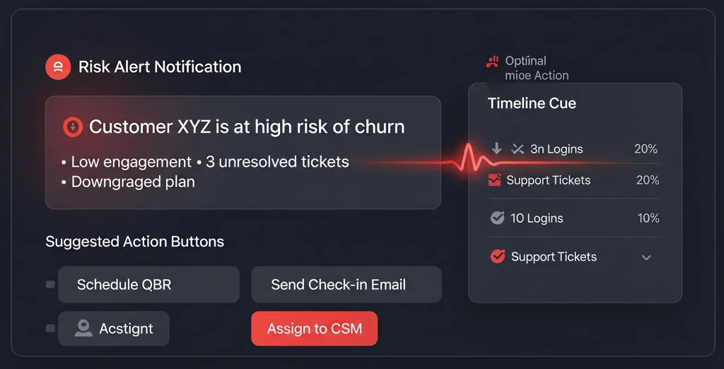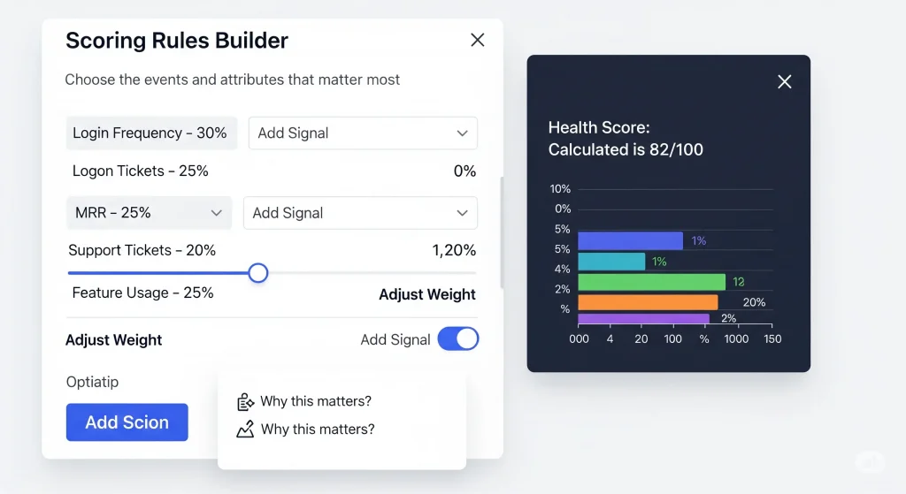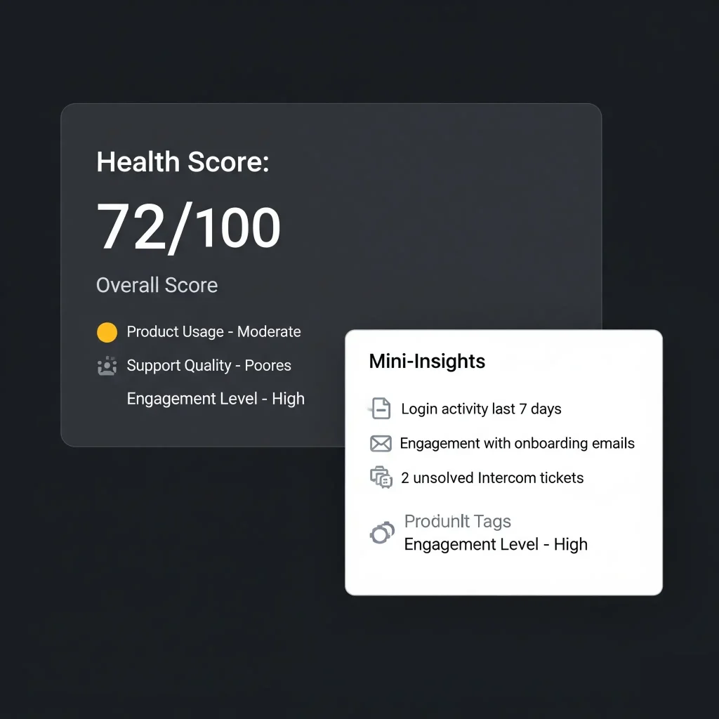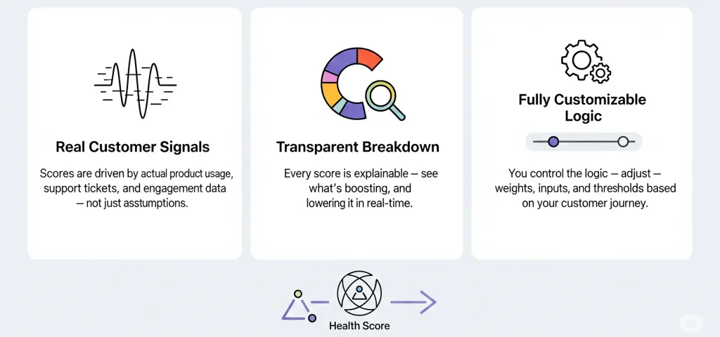 Each score reflects actual platform behavior, support interactions, and engagement, so you know why a customer’s health is low or high.
