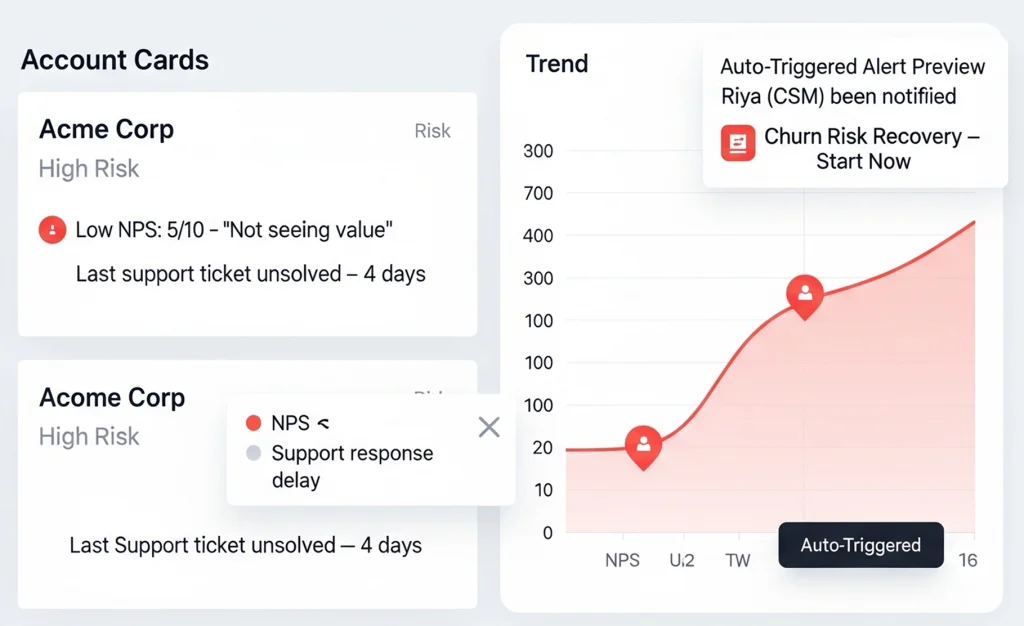 By surfacing red flags early, like reduced usage or unresolved tickets, you can act fast and prevent churn.