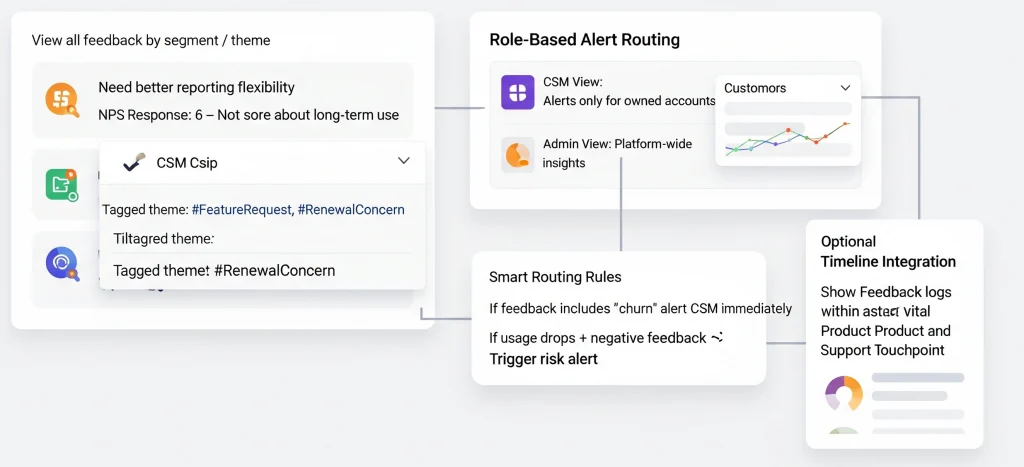 Personalize alert flows across roles based on user behavior and defined account rules. CSMs get updates for their accounts, while admins view everything at scale.