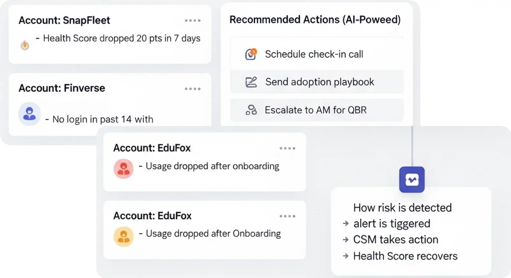 Health scoring and behavior tracking reveal early churn signals, so your team can intervene before revenue loss becomes irreversible.