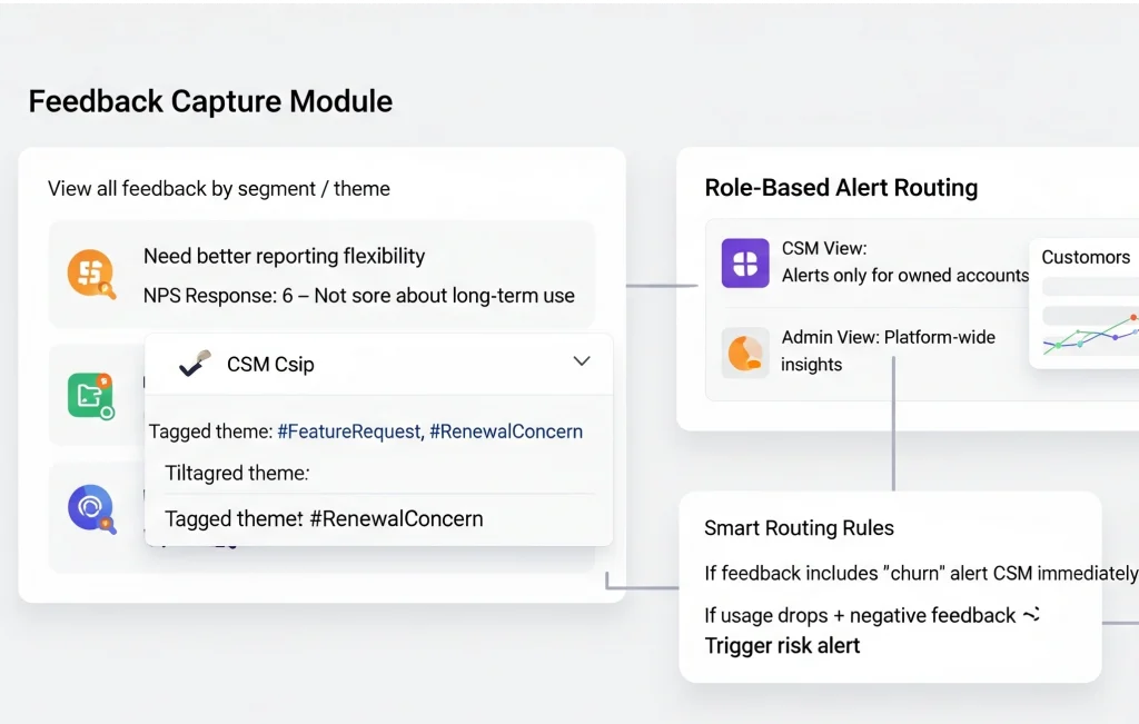 CSNook analyzes product usage drop-offs, support interactions, billing delays, and engagement gaps to assign predictive churn scores for each customer.